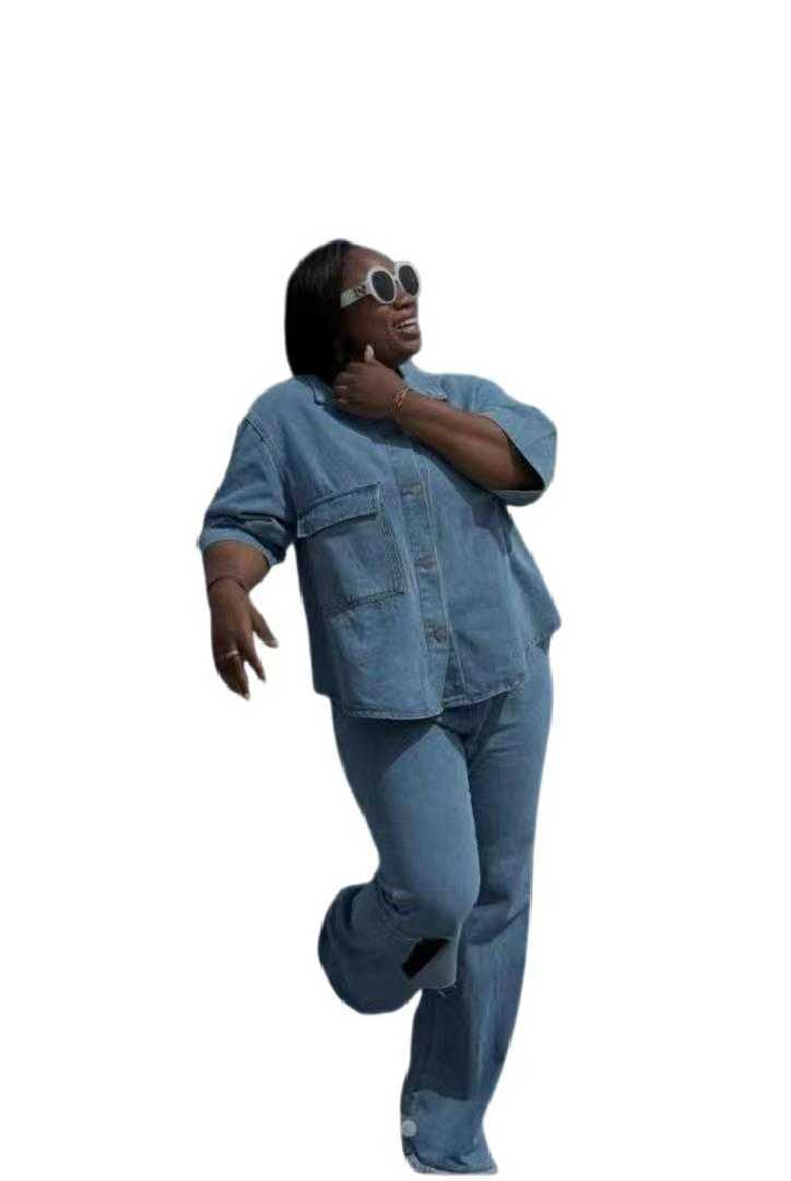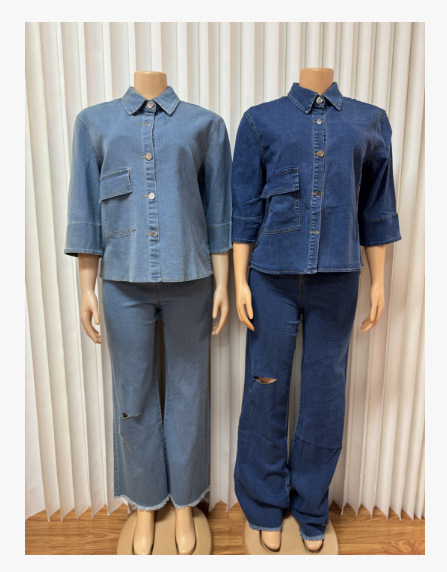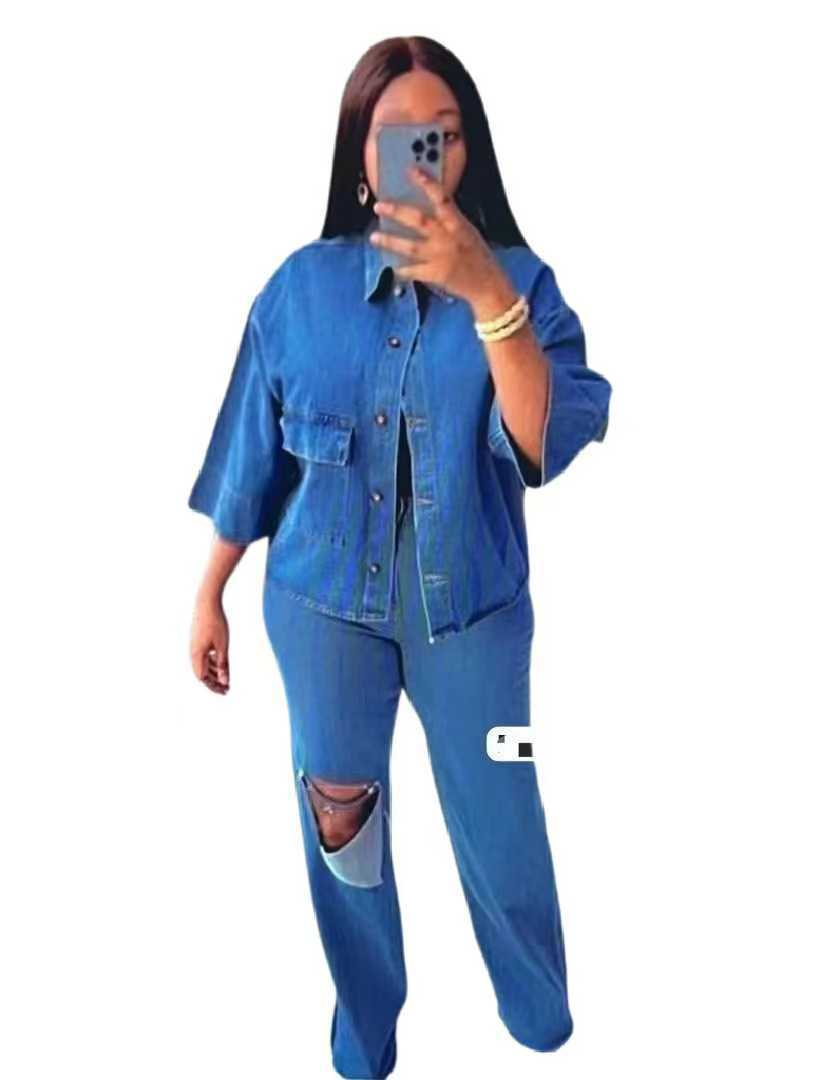 Personality Shirt Top Ripped Denim Trousers Two-piece Set